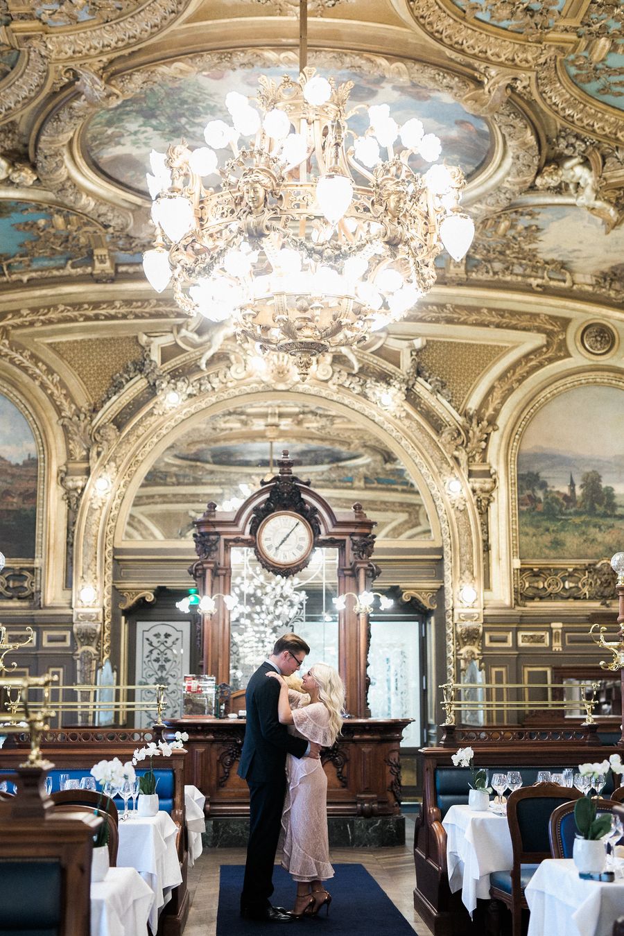 Nous avons choisi la France parce que c’est notre endroit préféré à tous les deux mais aussi parce que nous étions heureux de faire découvrir ce pays à nos invités à travers cette expérience intime et inoubliable. Nos deux familles aiment également beaucoup voyager, notamment en France. J’ai étudié l’histoire de l’art à l’université et Cameron l’opéra, donc la France était la destination idéale qui reflétait parfaitement notre amour pour les arts. Nous avons choisi d’arriver à Paris une semaine avant notre mariage pour faire notre brunch de demoiselles d’honneur, notre dîner de répétition, nos photos de couple et nos enterrements de vie de célibataire parce que nous adorons cette ville. Nous avons choisi Fontainebleau pour la location du château car ce n’était pas loin de Paris et que le cadre était féerique.