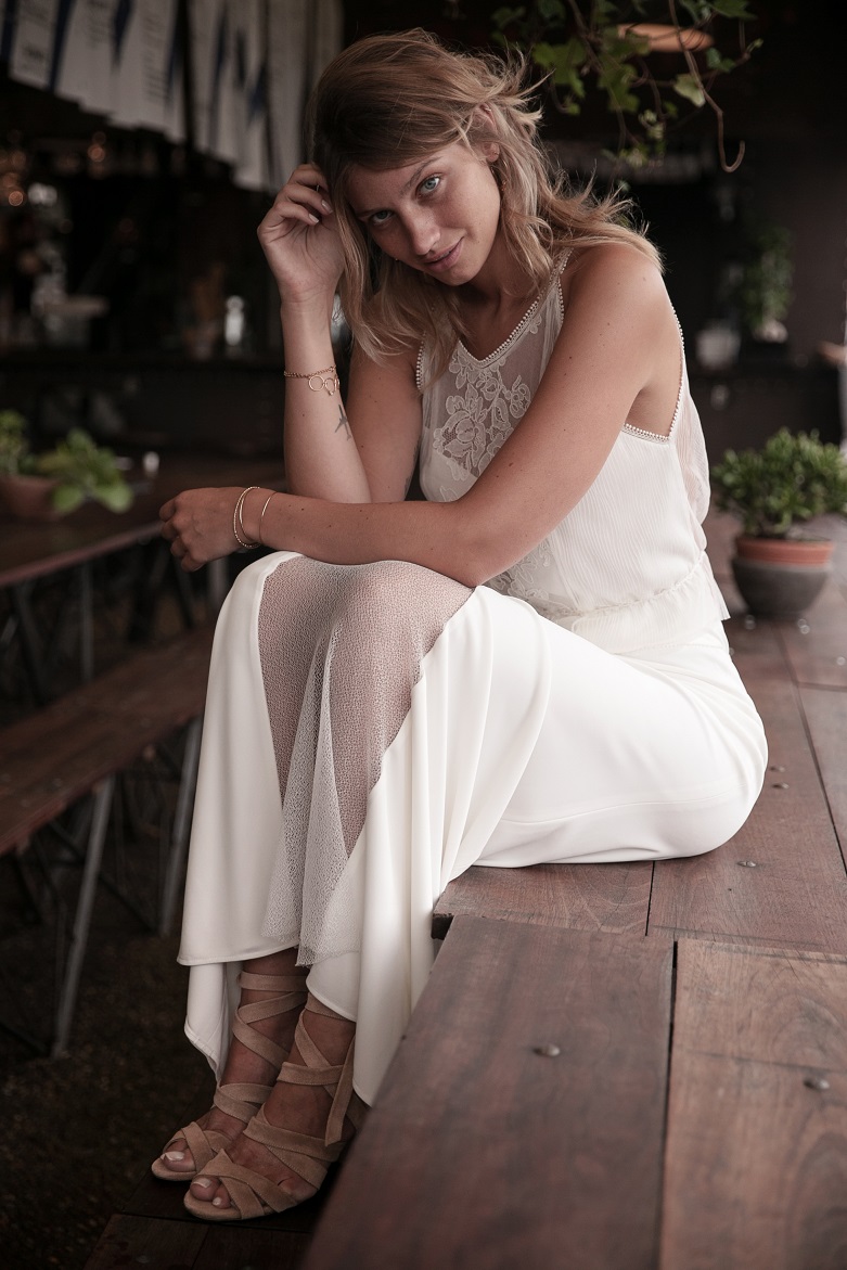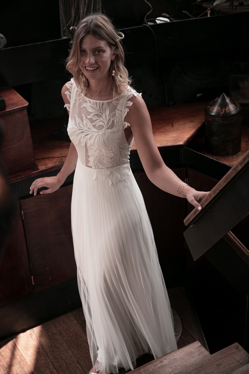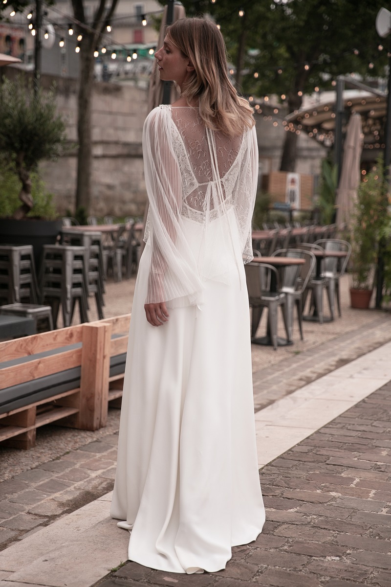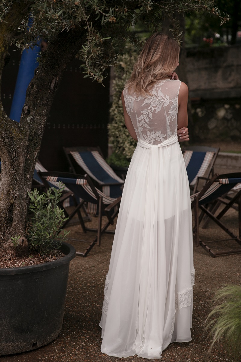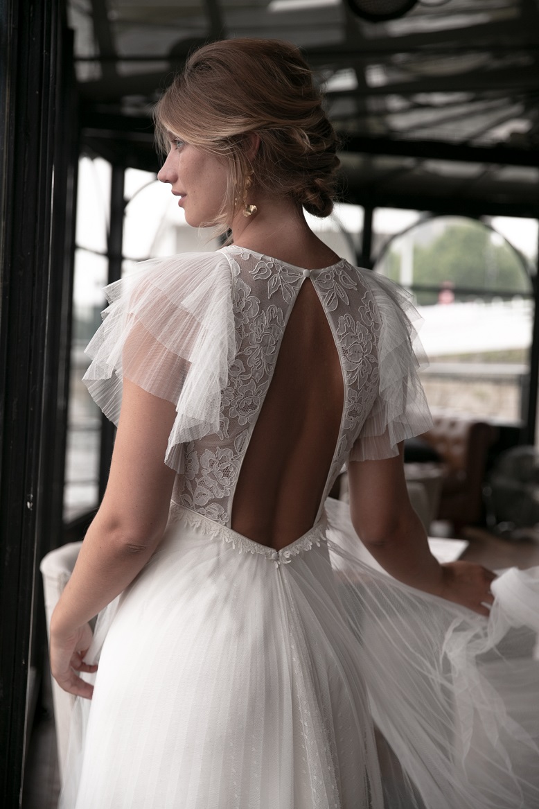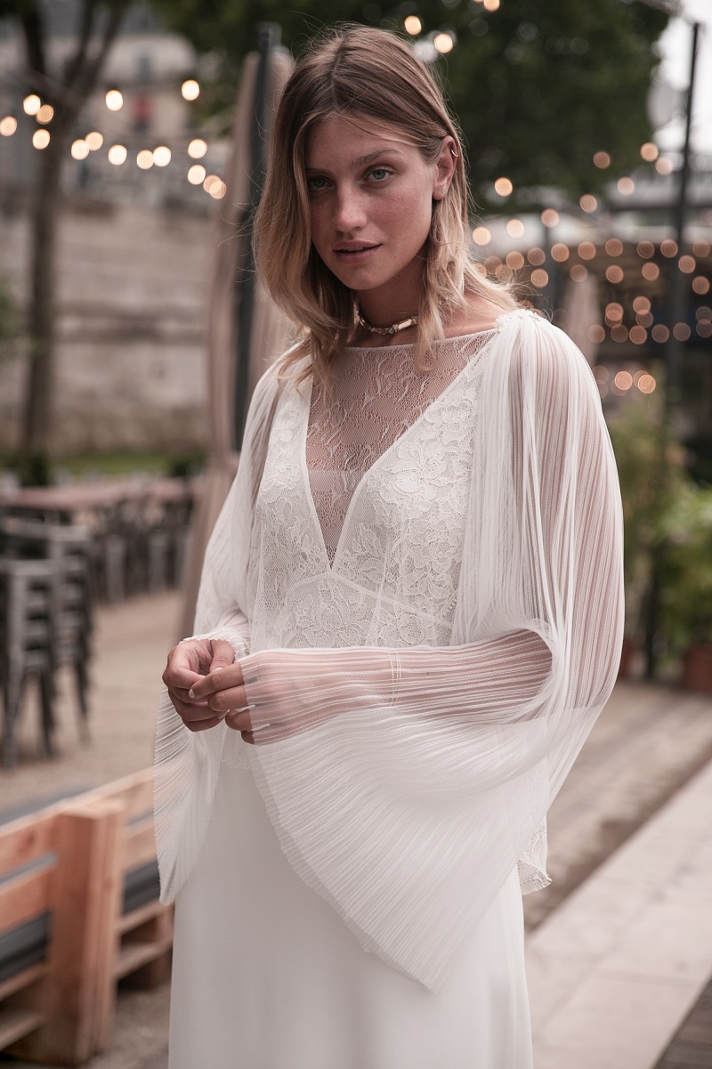 Les jeux de dentelles sont très présents sur toute la collection baptisée “L’Instant”. Il faut avouer que la styliste réussit à marier avec brio des dentelles aux motifs floraux aux plumetis, aux gallons …, ce qui donne, en plus de la matière, un effet de dynamisme, de finition et d’originalité à ses créations. Grand coup de coeur pour ces images aux airs d’une campagne des années 90.