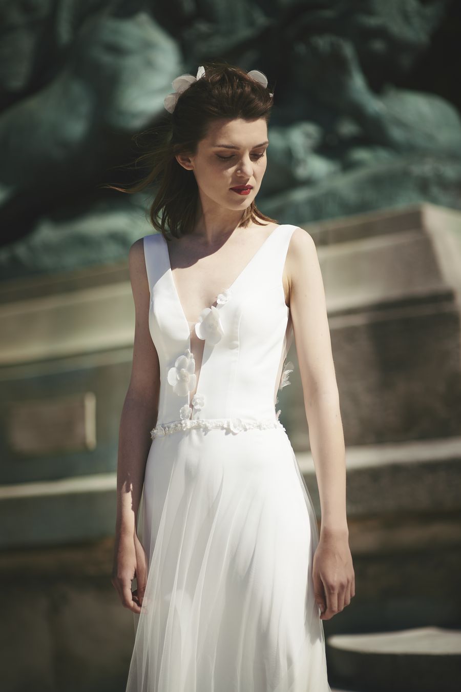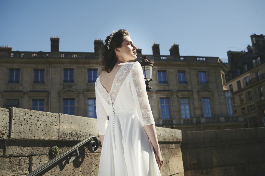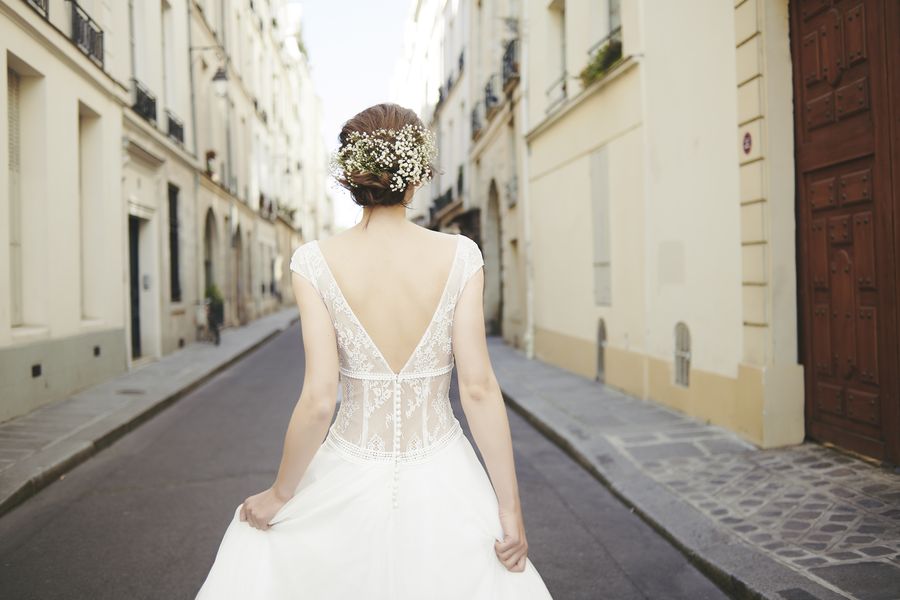 La mariée Cymbeline est sans aucun doute l’incarnation du style de vie Français. Assise devant la Tour Eiffel ou dans Montmartre, elle représente l’élégance à la française et une féminité assumée. C’est entre des détails dentelés, des plumes désinvoltes, une transparence domptée et quelques effluves de couleurs que l’on perçoit cette identité. Chez Cymbeline, la mariée de 2020 peut oser les combi-short transparentes en dentelle. Elle raffole d’ensembles à motifs originaux et de longues traînes. Son allure est féminine, élégante et audacieuse. Talons hauts, asymétrie, détails haute-couture, accessoires XXL… elle peut tout oser.