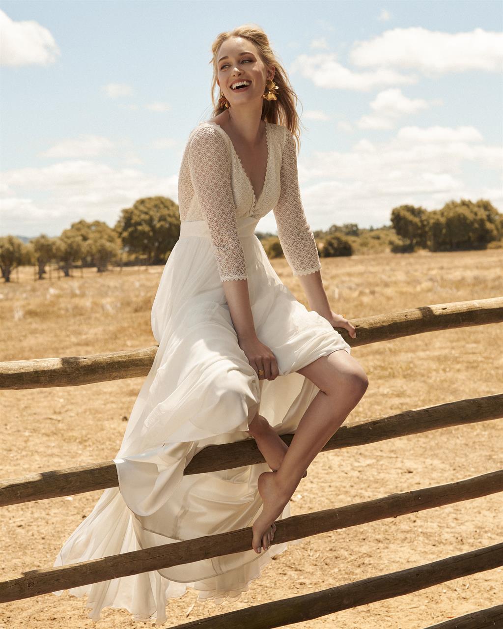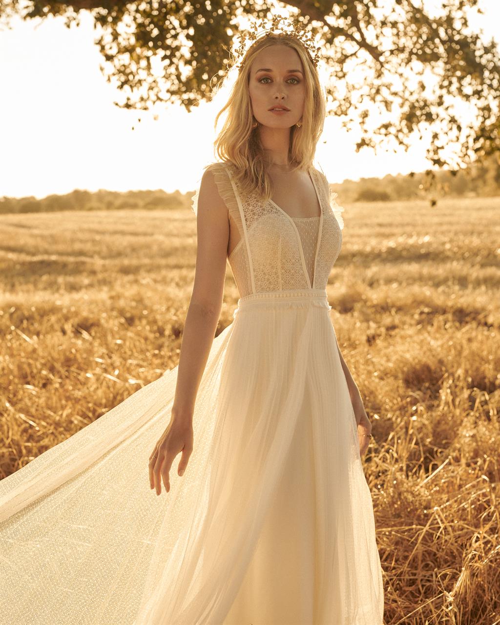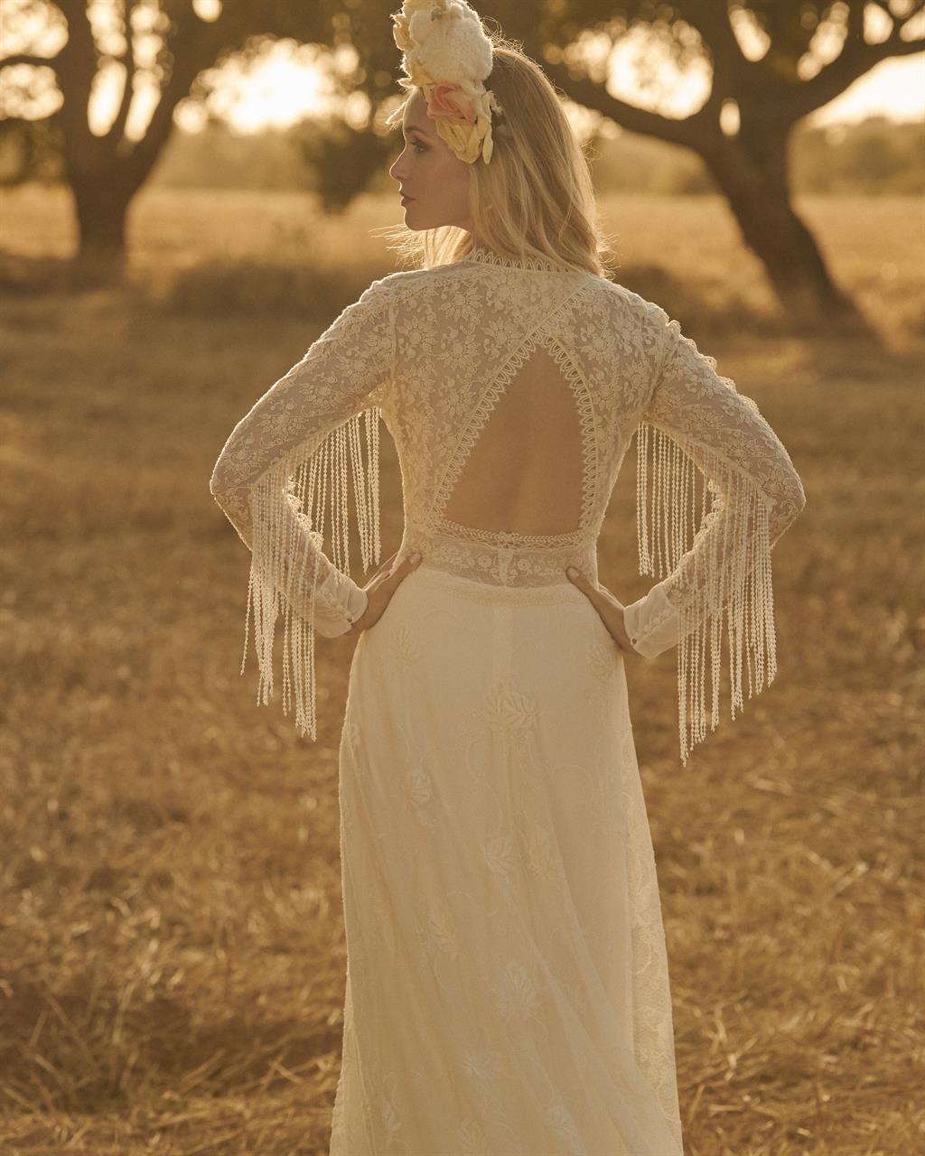 Pour la collection 2020, Rembo Styling nous propose un décor de vie sauvage avec une mariée libre et naturelle qui aime les grands espaces où elle peut respirer à pleins poumons et profiter de la vie. Ainsi, les robes se laissent porter par le vent et s’adaptent aux mouvements de la mariée. Les franges et les détails dentelés sont au rendez-vous pour des tenues à l’allure country.
