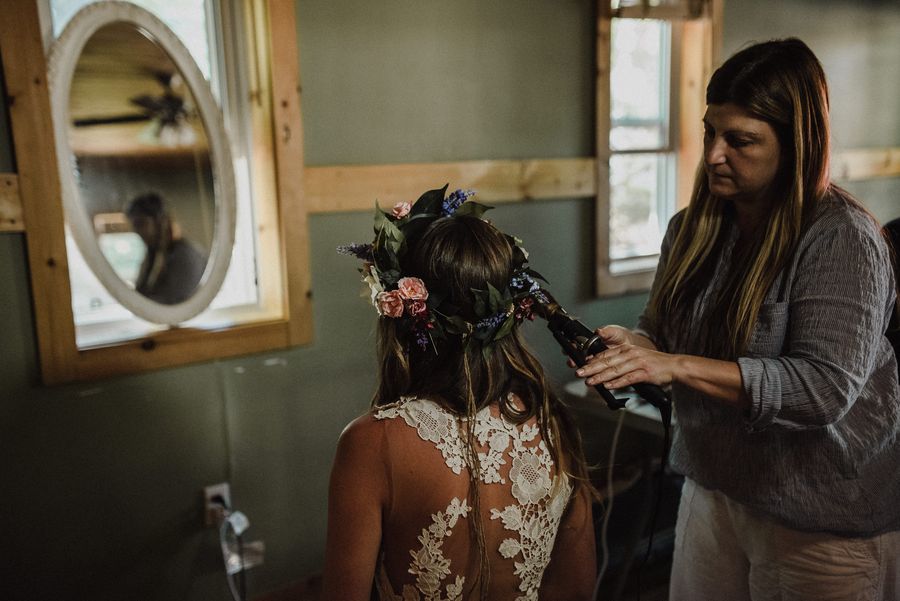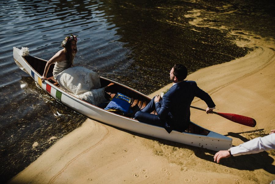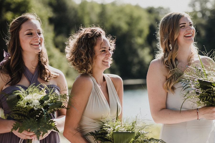 Notre mariage était romantique et rustique à la fois. Nous nous sommes mariés au milieu de la forêt sur un quai au-dessus de l’eau, nous l’appelions notre « Camp de mariage ». Nous voulions une ambiance détendue et insouciante pour profiter un maximum de nos invités.