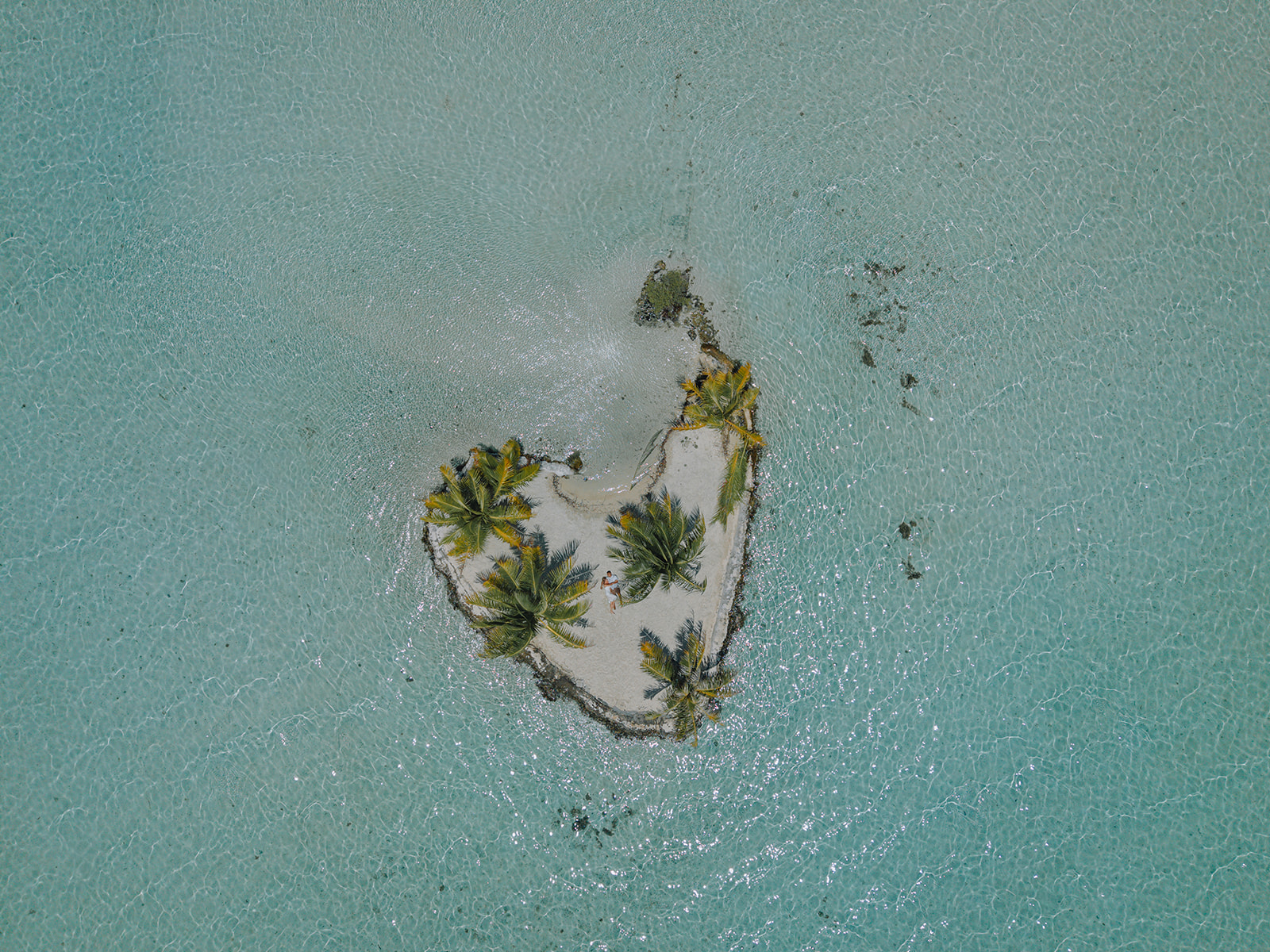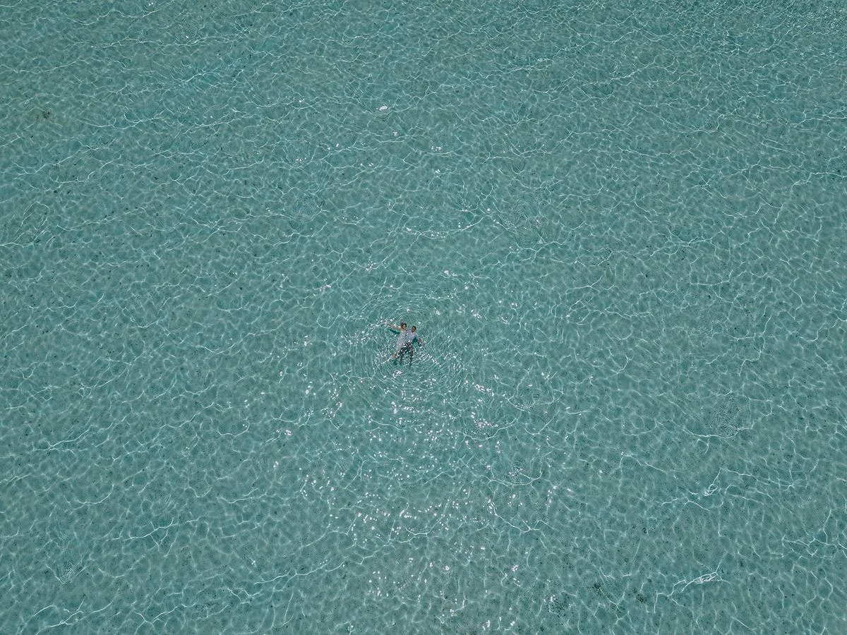 Pour la séance, on a travaillé le matin et c’était une évidence. À Taha’a, la lumière du matin fait quelque chose d’unique sur le lagon. Ces bleus… du turquoise le plus pâle jusqu’au bleu profond du large, tout y est. Le drone permettait de rendre justice à cette immensité, de montrer Sierra et Josh dans leur cadre : deux petits points lumineux au milieu de quelque chose de grand.