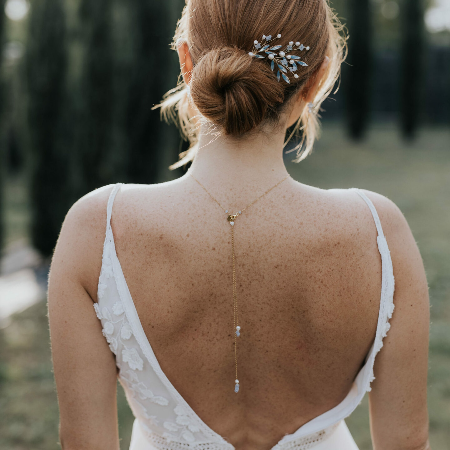 “Je tenais vraiment à intégrer cette tradition, car ma grand-mère m’en parlait souvent. J’ai porté ses boucles d’oreilles en perles (quelque chose de vieux), une robe toute neuve de chez Elsa Gary, une broche prêtée par ma meilleure amie et… un vernis bleu pâle sur les ongles de pied ! Personne ne l’a vu, sauf moi, et c’est ce qui rendait le clin d’œil encore plus spécial.”