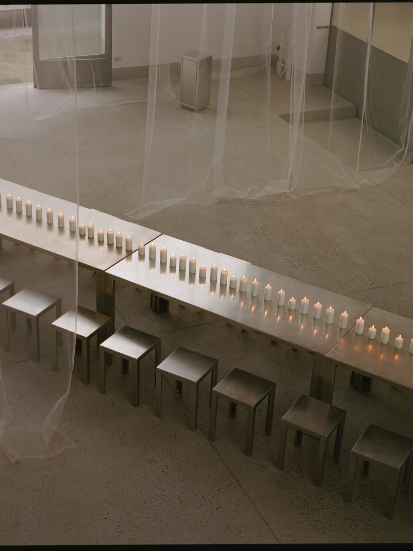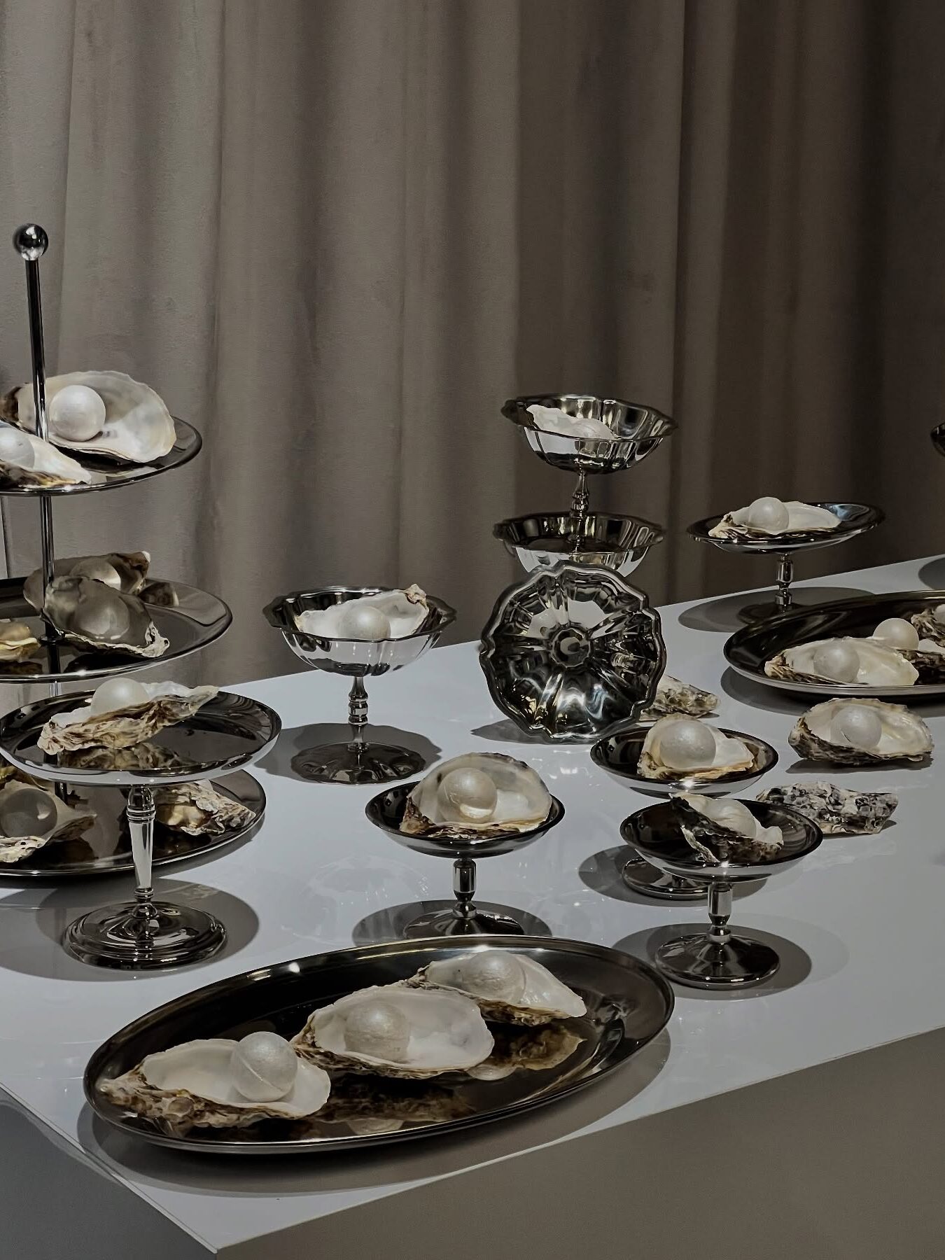 On retrouve ces nuances dans des détails souvent discrets mais essentiels : structures fines en métal poli, éléments de mobilier aux reflets glacés, touches chromées sur les tables ou les buffets. Même les chaises et les assises, parfois, adoptent ce fini argenté.