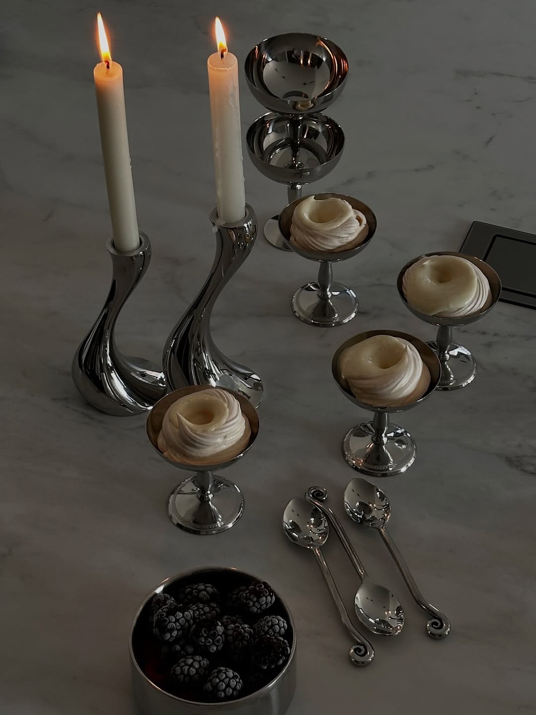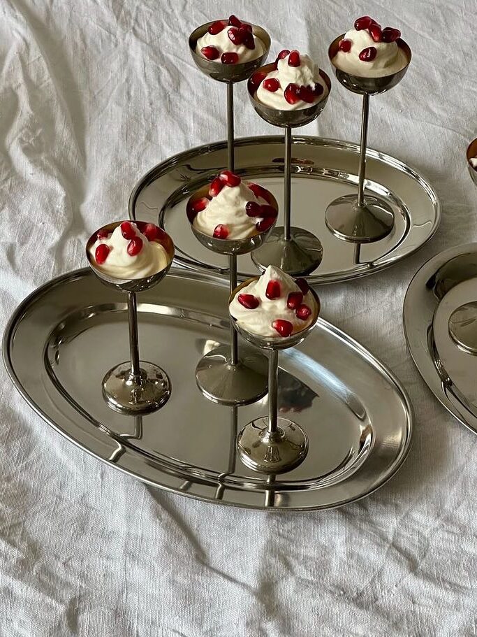 Le métallisé argenté s’invite aussi dans les créations sucrées. Les cake designers utilisent aujourd’hui des pigments comestibles aux effets chromés pour donner aux gâteaux une allure de pièce artistique. Qu’il s’agisse d’un voile argenté, d’un décor miroir ou d’une simple ligne métallique, le rendu est spectaculaire et s’accorde parfaitement avec des présentoirs eux-mêmes brillants ou réfléchissants. C’est souvent sur cette table que la tendance s’exprime le plus librement, offrant un moment “wow” très photographié.