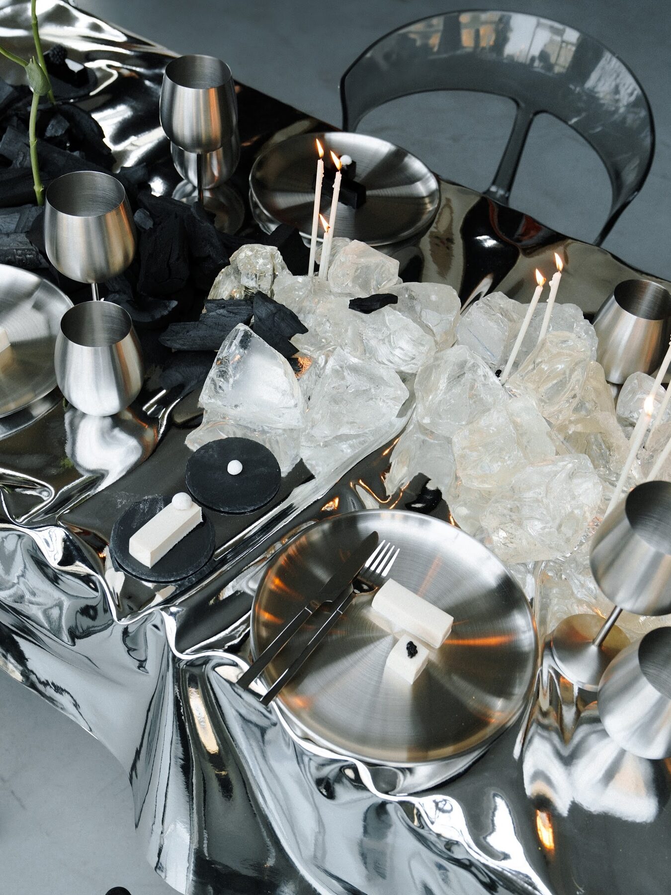 Tables, vaisselle et décor : le règne du miroir et du chrome