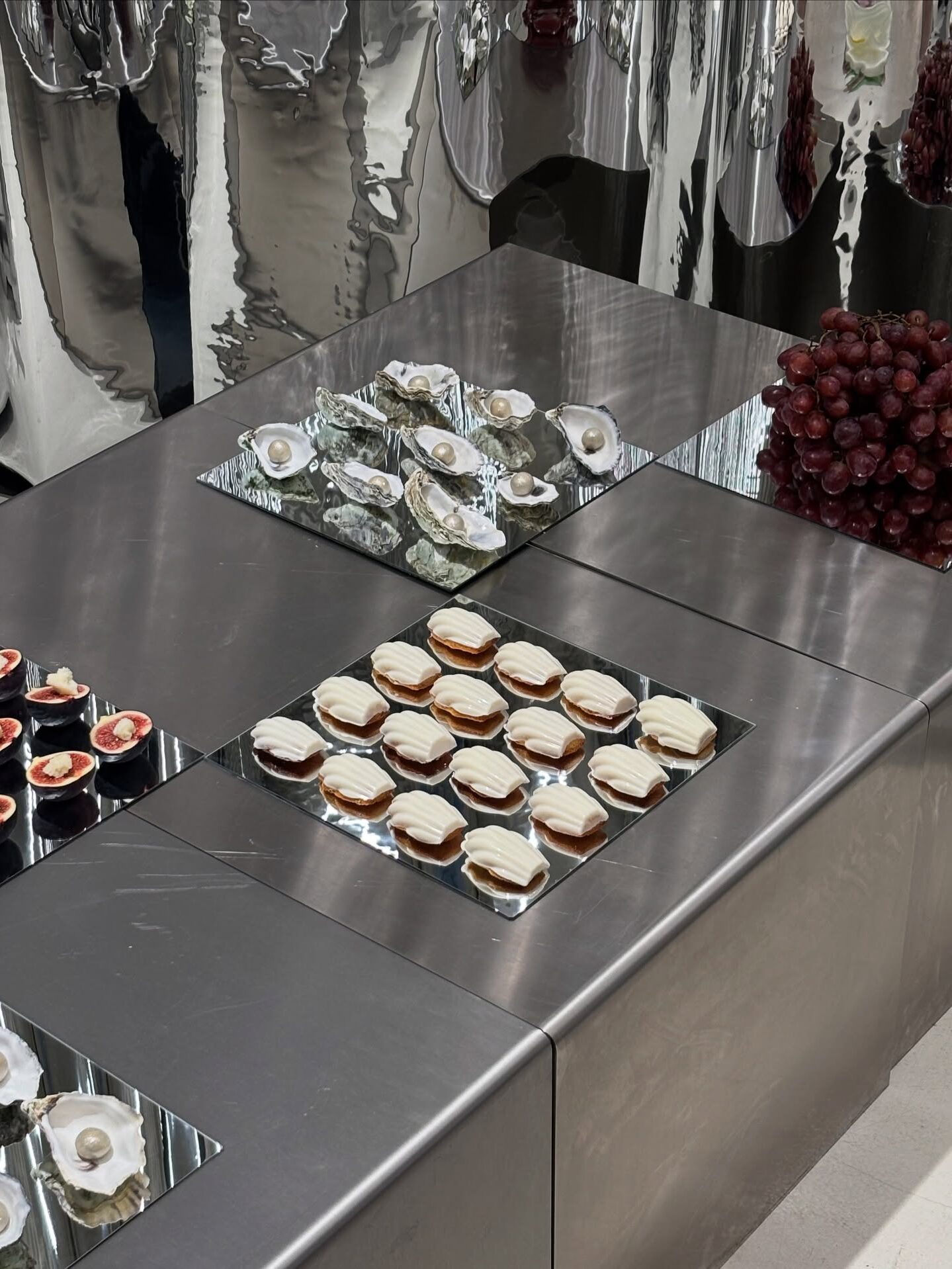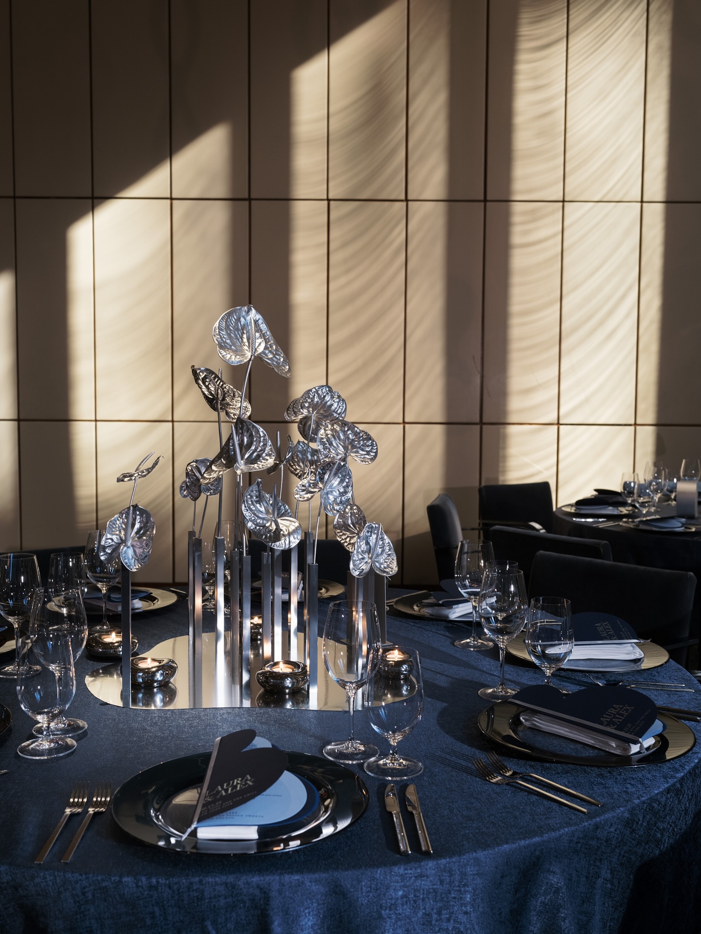 La vaisselle suit le mouvement : couverts argentés, verres aux reflets métalliques, assiettes cerclées d’un filet mirror. Tout s’accorde pour créer une ambiance d’élégance contemporaine. Même les présentoirs des buffets, souvent en métal poli ou en miroir, participent à cette scénographie argentée, donnant une intensité visuelle inhabituelle aux pièces cocktails ou au bar à desserts.