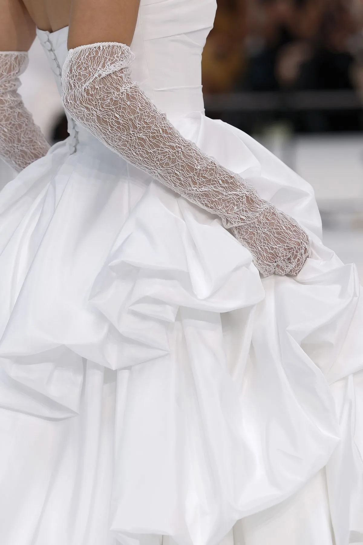 Autre détail phare : les gants froncés, qui apportent du volume. Cette finition, souvent réalisée sur des matières fluides, apporte du romantisme contemporain. Le jeu de plis et de fronces ajoute du relief à la tenue, sans l’alourdir, et permet à la mariée d’affirmer un style unique. Associés à des robes épurées, ces gants deviennent un vrai point d’attention, parfait pour celles qui cherchent à marier tradition et avant-garde.