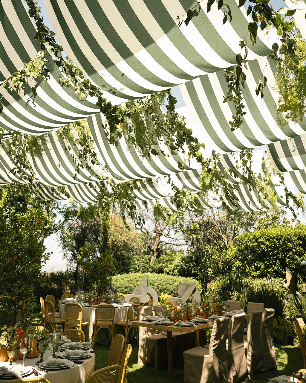 S’inspirer du cirque ne signifie pas reproduire un chapiteau. L’idée est d’en extraire les marqueurs visuels pour les traduire avec élégance. Les rayures, emblématiques de cet univers, peuvent être utilisées sur la papeterie, les nappages ou certains éléments de signalétique. Les drapés et les tissus tendus rappellent les toiles du chapiteau tout en apportant une touche théâtrale à la réception.