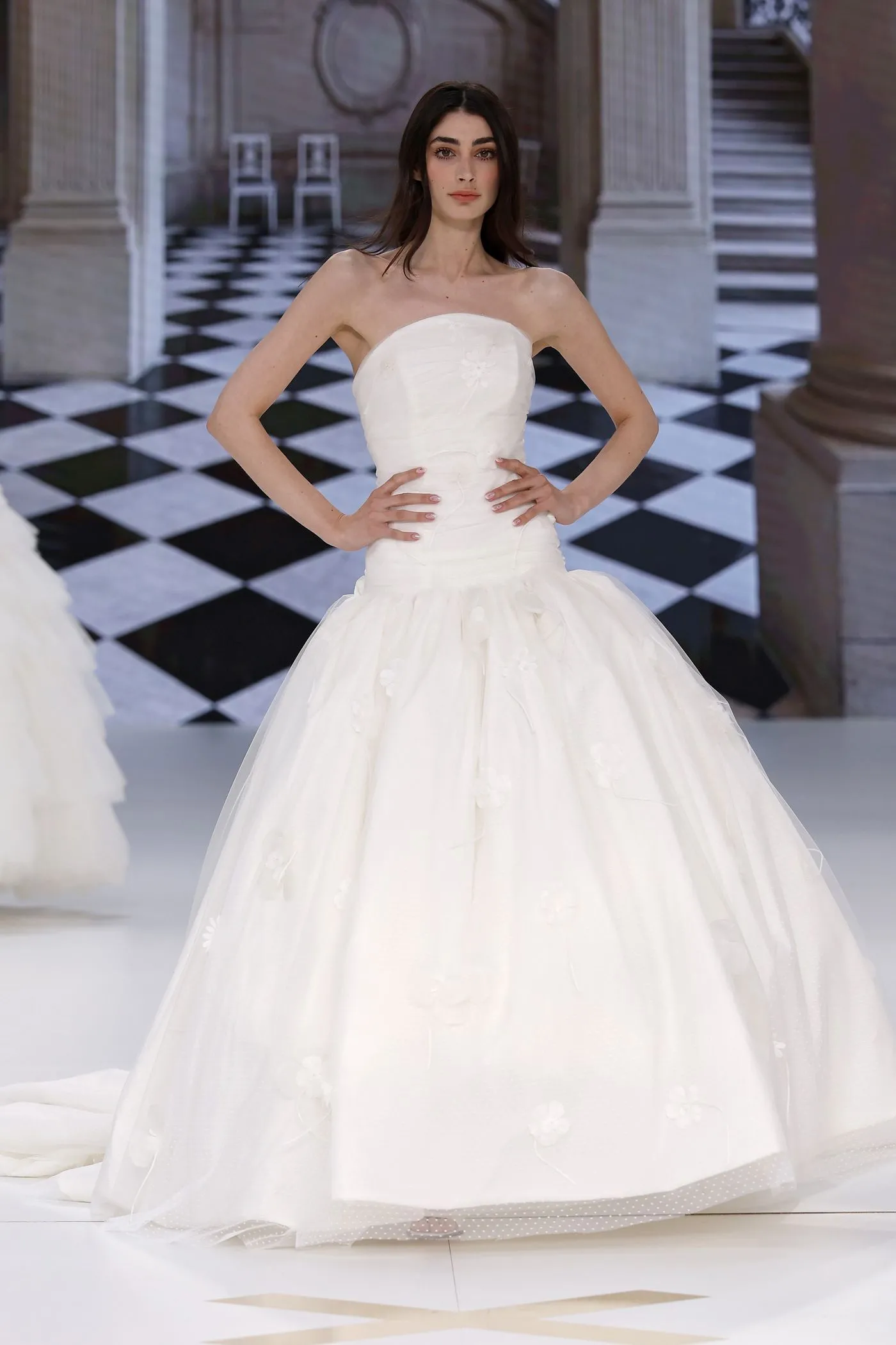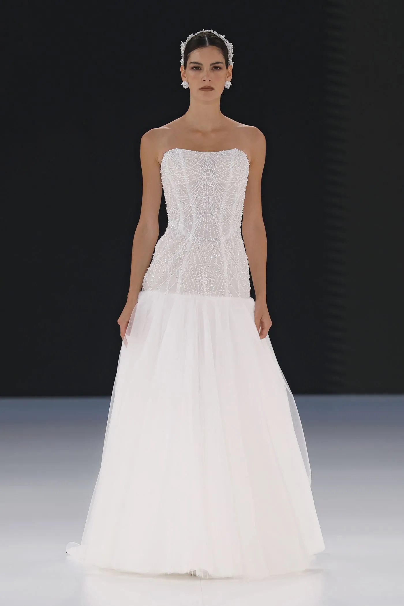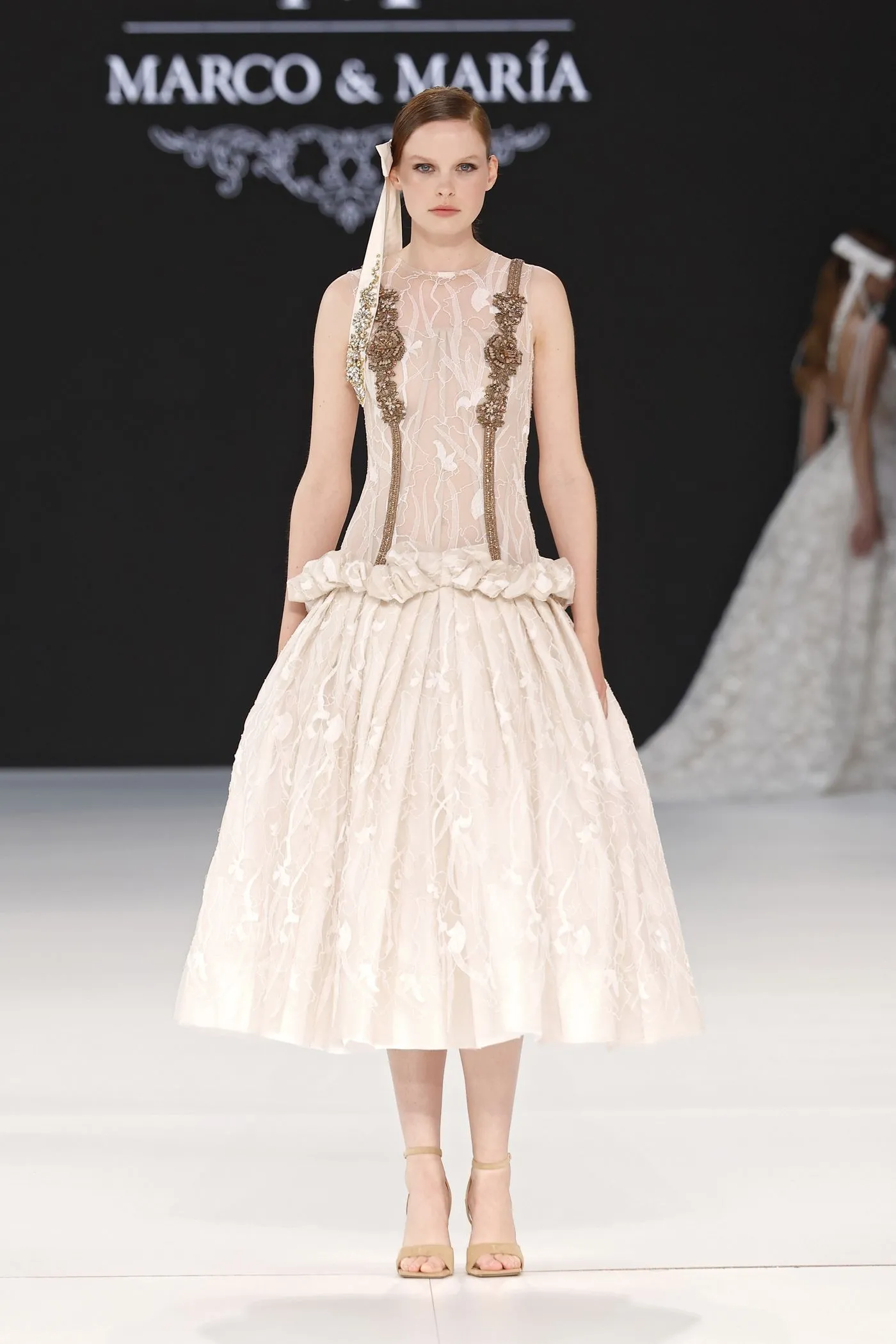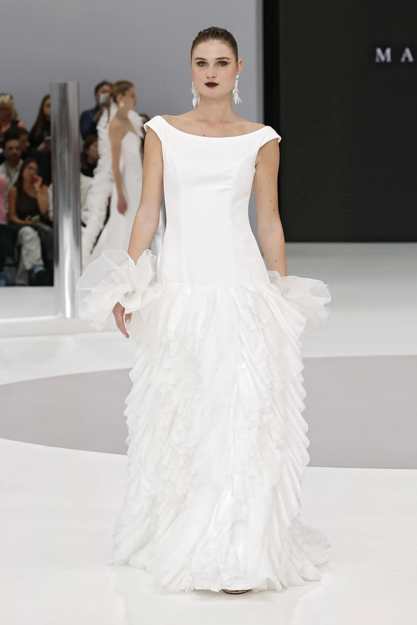 Inspirée des années 20, époque où la robe de mariée adoptait une taille descendue pour créer des lignes droites et allongées, la version 2026 est à la fois élégante, fluide et structurée. Dévoilée récemment à la Bridal Fashion Week de Barcelone, cette tendance a été remarquée dans les nouvelles collections des créateurs.