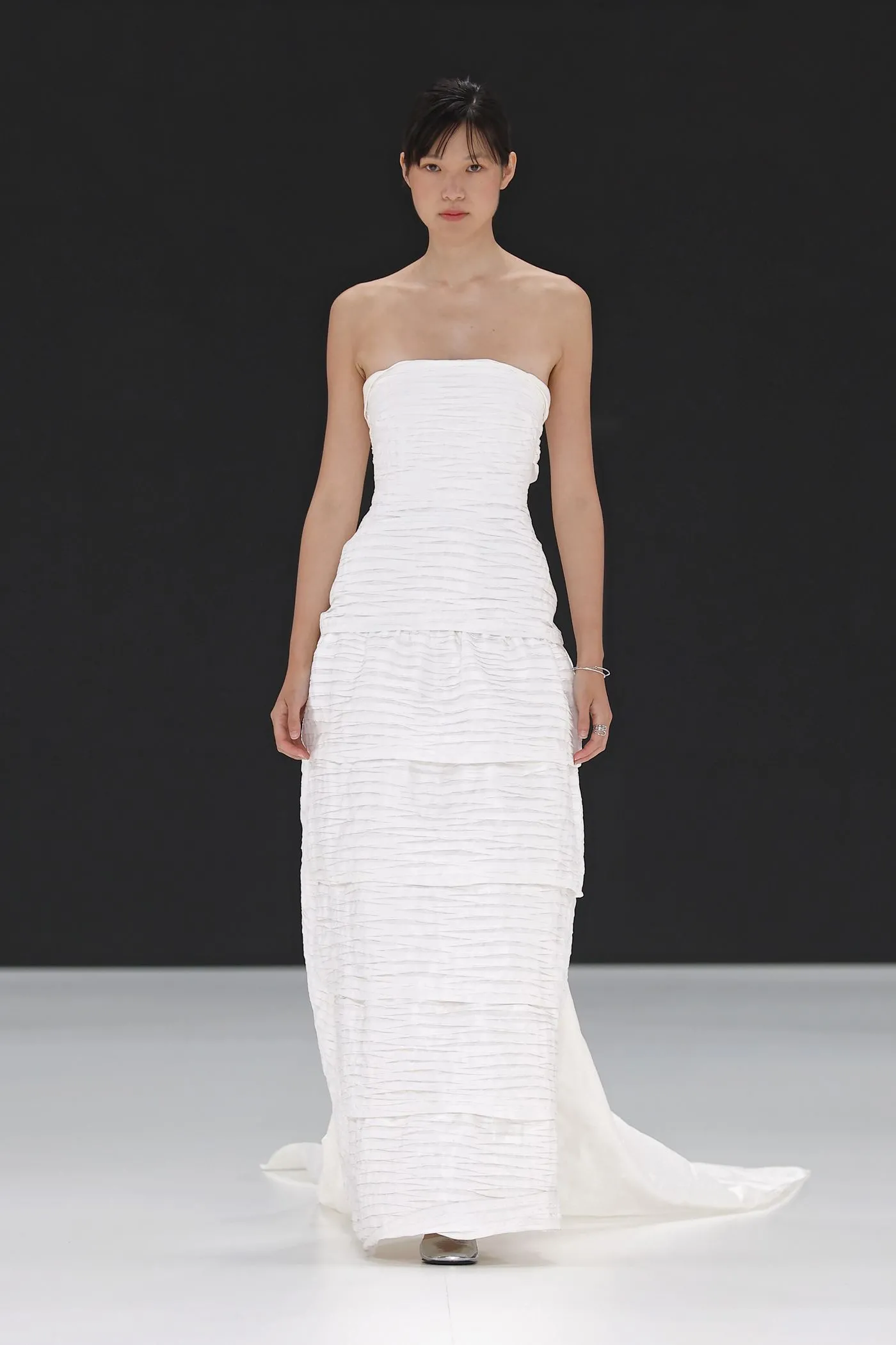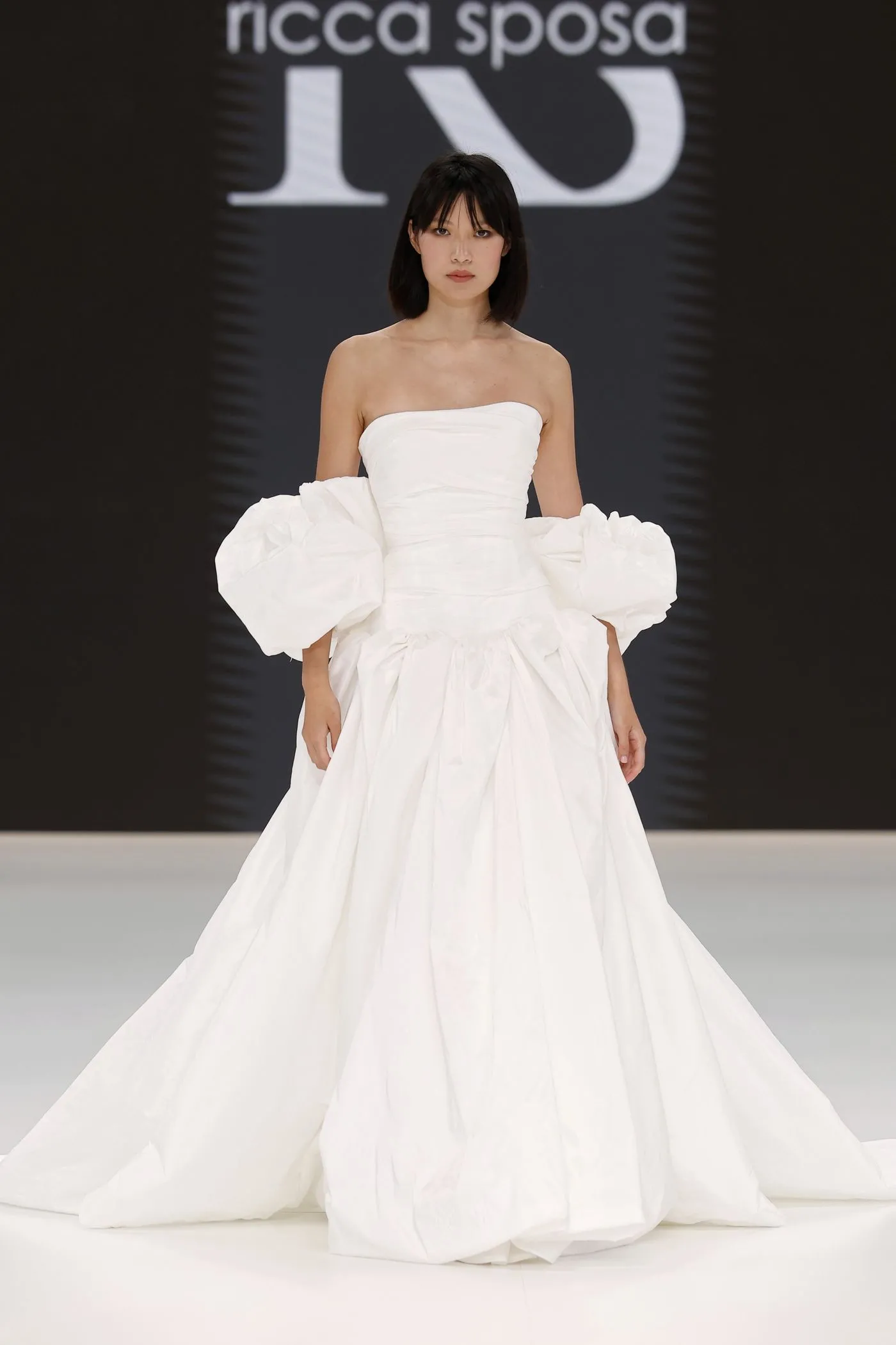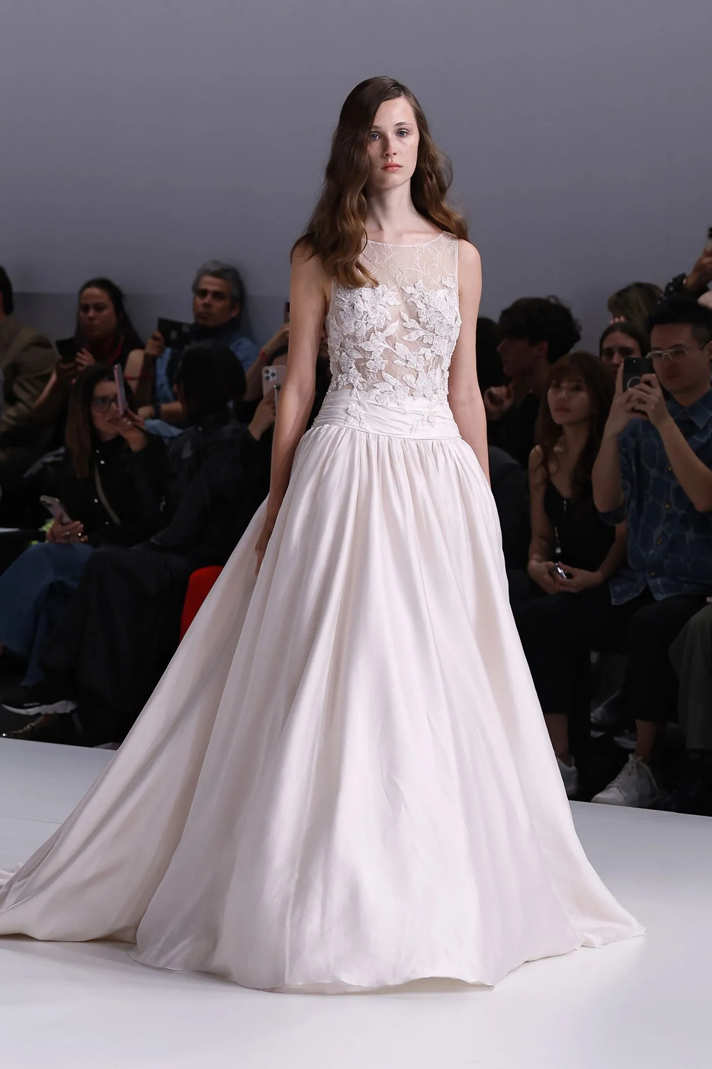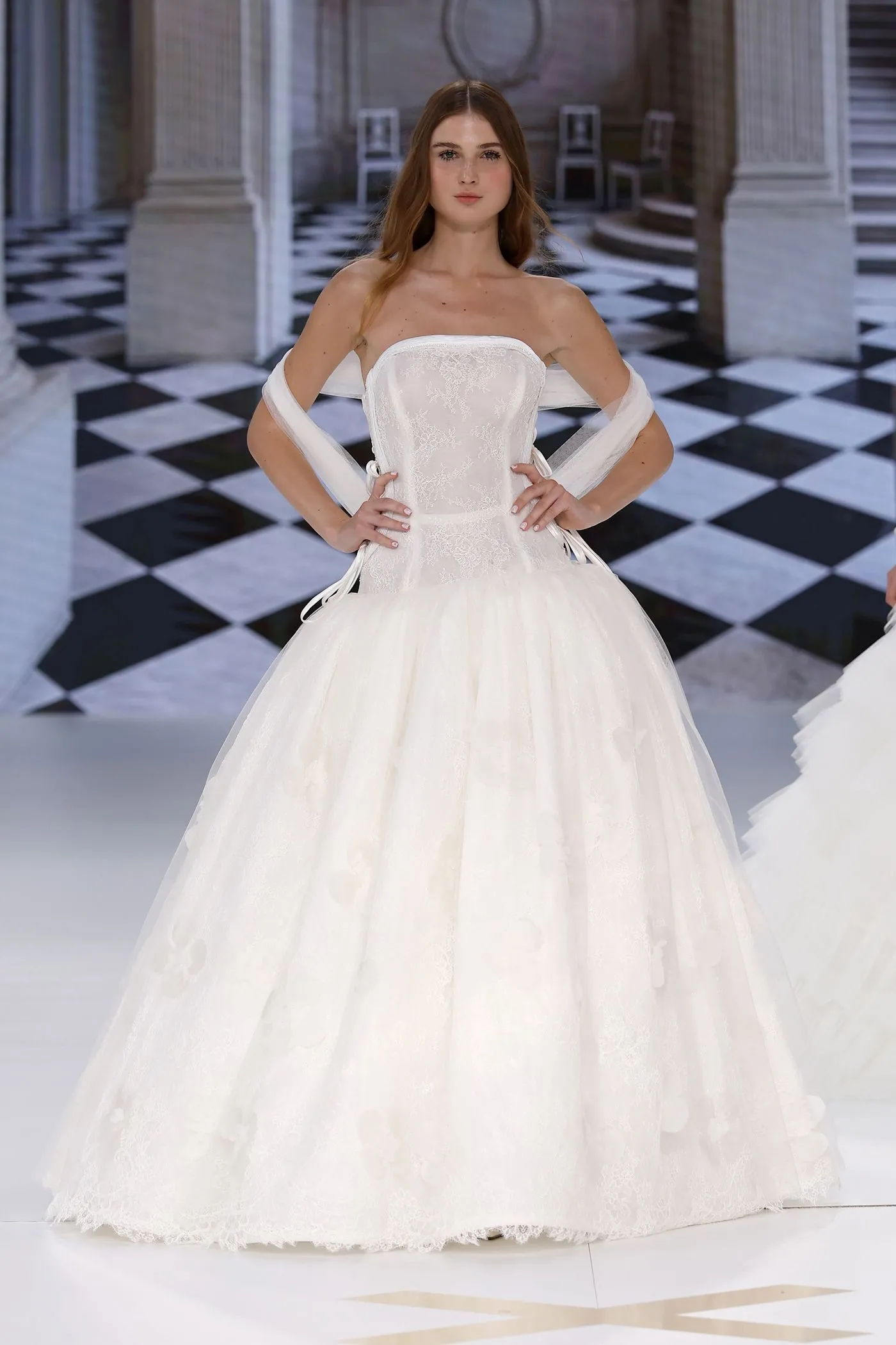 Inspirée des années 20, époque où la robe de mariée adoptait une taille descendue pour créer des lignes droites et allongées, la version 2026 est à la fois élégante, fluide et structurée. Dévoilée récemment à la Bridal Fashion Week de Barcelone, cette tendance a été remarquée dans les nouvelles collections des créateurs.
