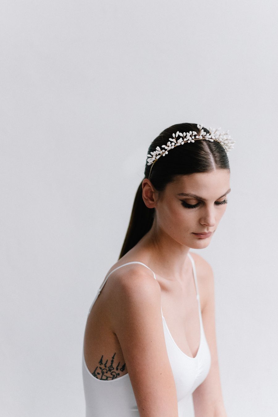 On shoppe cette robe patineuse de chez Maison Lemoine pour une allure moderne et élégante. On va pouvoir l’accessoiriser avec la sublime couronne de chez Maison Sabben et des escarpins dorés de chez Bobbies.