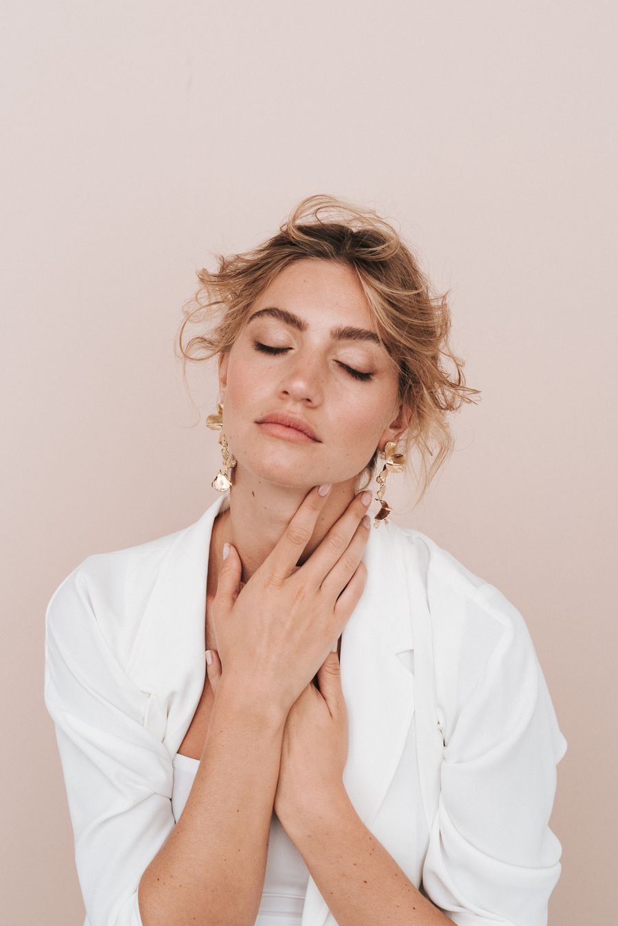 Coup de cœur pour cette robe Harpe, qui est une édition de la robe que portait la créatrice de la marque le jour de son mariage. On aime les manches bouffantes avec la finition de dentelle pour un look gypsy, bohème et moderne parfaitement maîtrisé. Pour sublimer cette tenue, on opte pour les boucles d’oreille Univers en forme de fleurs déstructurées, dorées à l’or fin. C’est un modèle phare de la saison chez Maison Sabben. Pour finir ce look pour se dire Oui à la mairie, on shoppe une paire de sandales dorées de chez Bobbies.