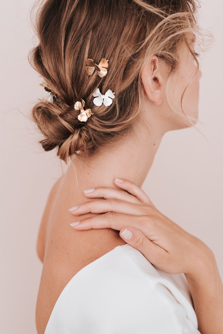 Nous avons flashé sur ce modèle de la maison L’amusée qui est disponible au Printemps Mariage. L’association de cette dentelle avec une coupe cache-cœur dans le dos et la petite jupe épurée est absolument parfaite pour passer devant Monsieur ou Madame le Maire avec style. On viendra parsemer délicatement sa chevelure avec les pinces de chez Maison Sabben qu’on accompagnera avec les escarpins Glitter de chez Bobbies.