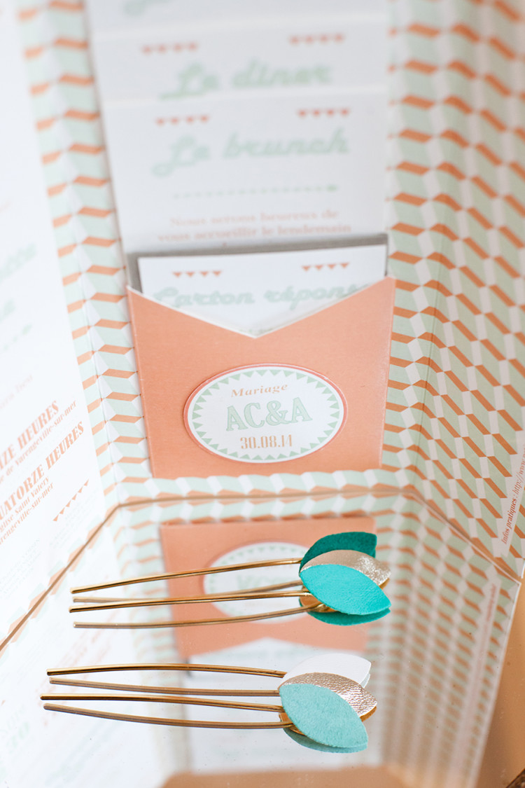 Nous avons choisi le thème des années 50, plutôt tourné vers les États-Unis. Ce thème était guidé par deux couleurs : vert menthe et pêche. C’était un réel plaisir de parcourir les brocantes pour trouver des accessoires anciens pour la décoration, en particulier de la vaisselle des années 5O vert menthe pour le brunch !